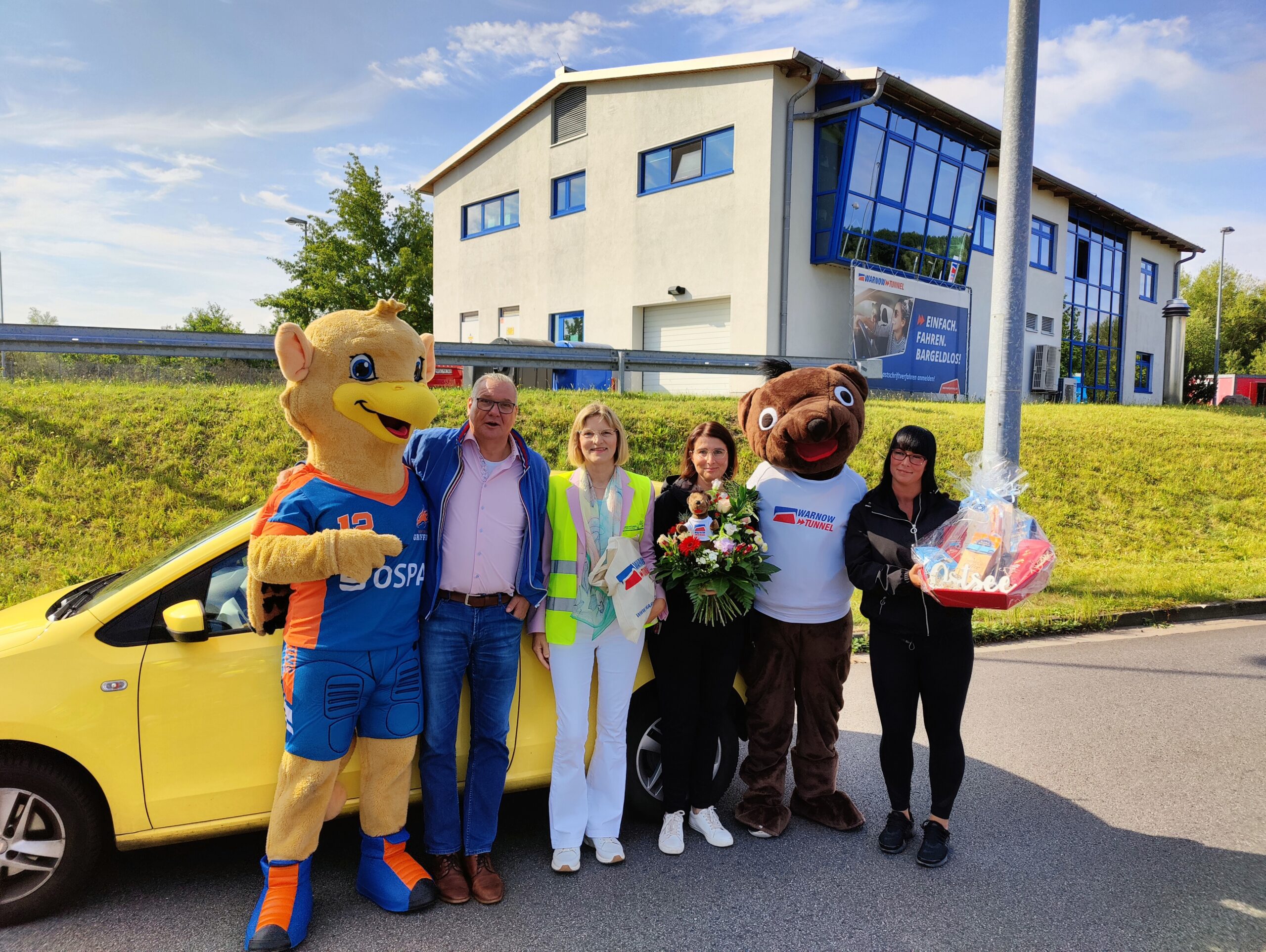 Gemeinsam mit den Freunden des Tunnels vom Warnow Park in Lütten Klein und den Rostock Griffins nahm die Geschäftsführerin des Tunnels, Frau Osterkamp, die glückliche Millionenfahrerin Frau Anne Palischewski in Empfang. „Ich muss zur Arbeit, ich habe nur fünf Minuten Zeit!“, sagte sie aufgeregt bei der Begrüßung. Wir gaben uns alle Mühe, dieser Bitte selbstverständlich nachzukommen. Nachdem sich die Aufregung gelegt hatte, tat sie ihre Freude kund und ein breites Lächeln strahlte allen entgegen, als sie am rechten Fahrbahnrand aus dem Kleinwagen stieg. Frau Osterkamp überreichte ihr einen großen, wunderschönen Blumenstrauß mit einem kleinen Otter-Plüschtier und herzlichen Glückwünschen vom Warnowtunnel. Dazu gab es einen Präsentbeutel mit einem 80 €-Tankgutschein, drei Gutscheinen zur Textil-Autowäsche in der Waschanlage bei Globus in Roggentin im Wert von knapp 40 €, den 25. Band von „Rostocker Panoramen“ von Helmut Aude sowie weitere kleine Überraschungen. Herr Middendorf und Frau Zimmermann vom Warnow Park überreichten einen großen Präsentkorb sowie zwei Einkaufsgutscheine im Wert von 50 €. Die Maskottchen Griffino von den Rostock Griffins und Otter Oscar vom Warnowtunnel gratulierten ebenfalls ganz euphorisch.