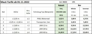 Im Gesetz- und Verordnungsblatt (2022, Nr. 38) vom 28. September 2022 wurde die fünfzehnte Verordnung zur Änderung der Verordnung über die Höhe der Maut für die Benutzung der Warnowquerung veröffentlicht. Danach gelten ab dem 01.11.2022 folgende Tarife:
